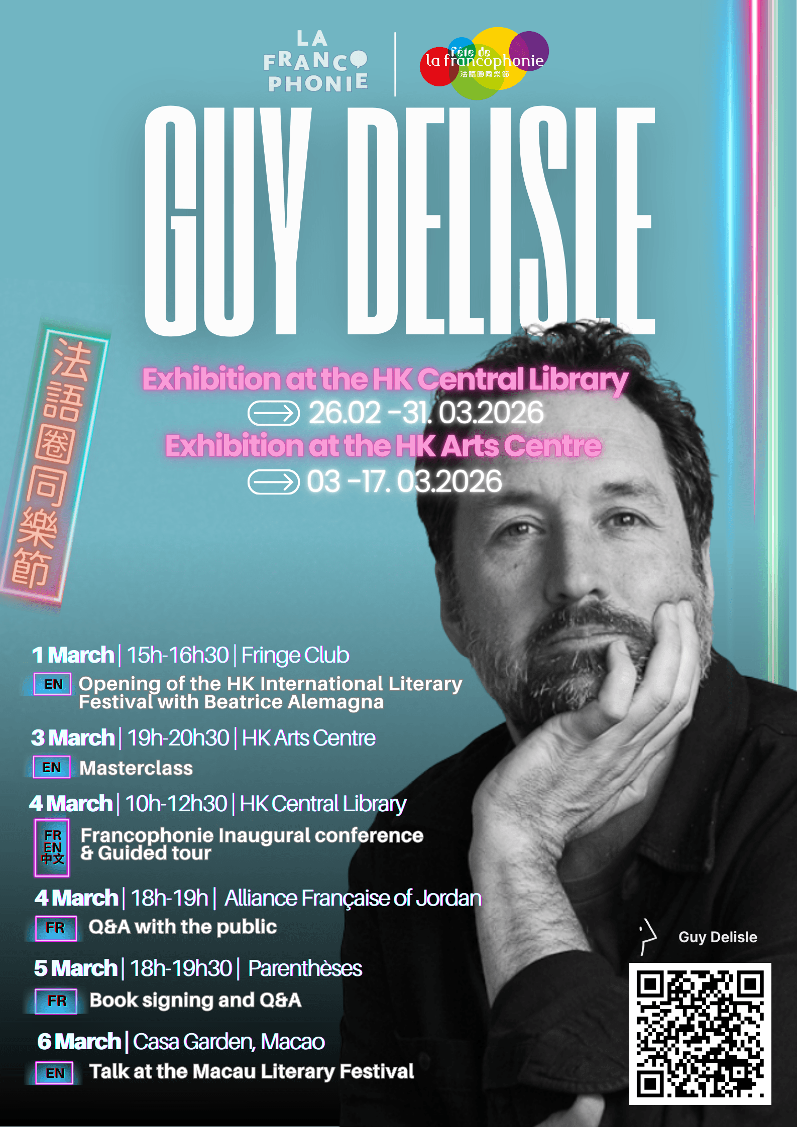 👥 Throughout his stay, the public will have the opportunity to meet him at numerous open events. In particular, he will speak at the Francophonie Opening Ceremony on March 4 at the Hong Kong Central Library, where an exhibition dedicated to his work will be on display until April 14. Guy Delisle will also take part in numerous cultural events in Hong Kong, Shenzhen, Guangzhou, and Macau.