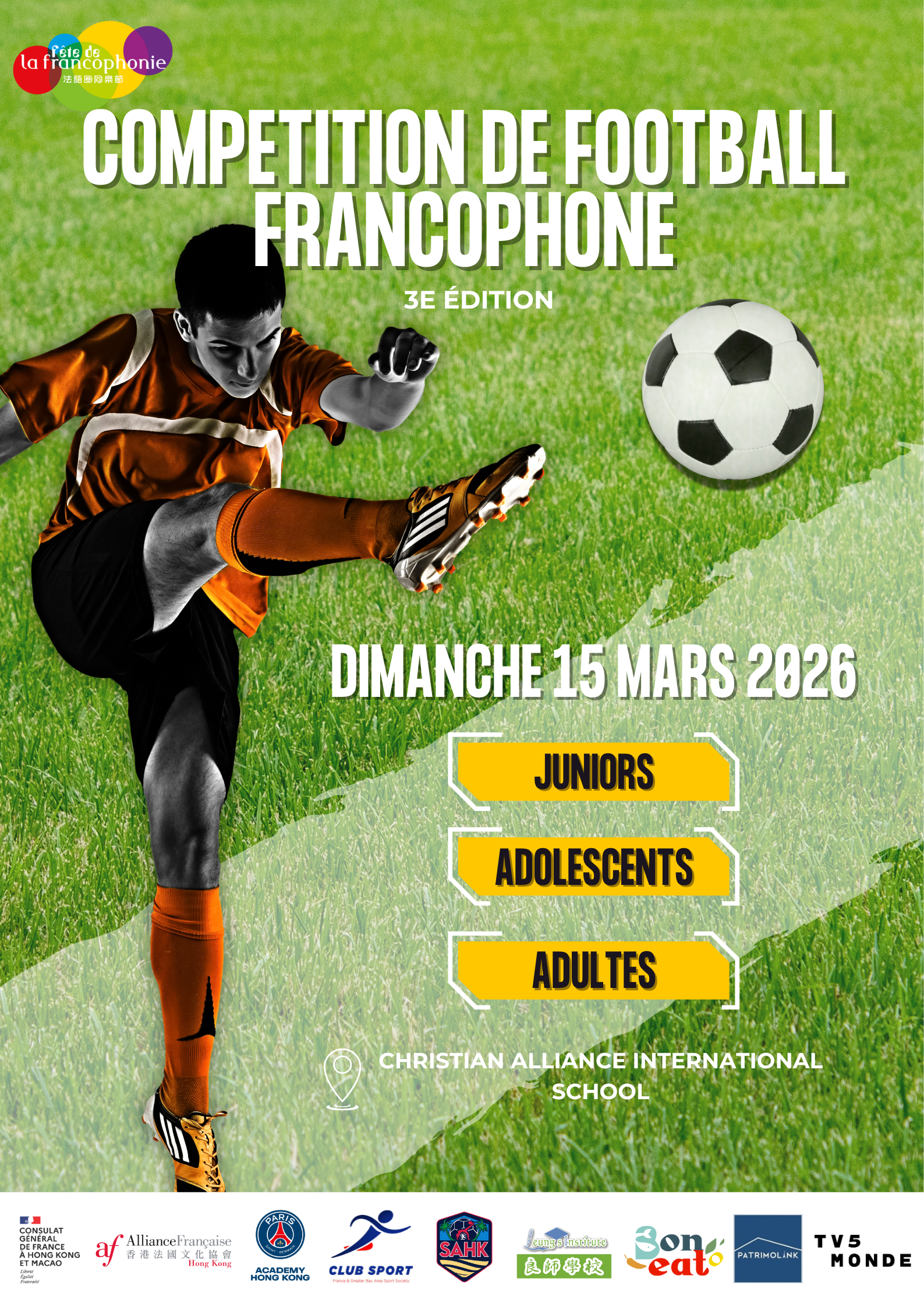 The Francophone Football Competition will take place on Sunday 15 March 2026 at the CAIS school in Lai Chi Kok.