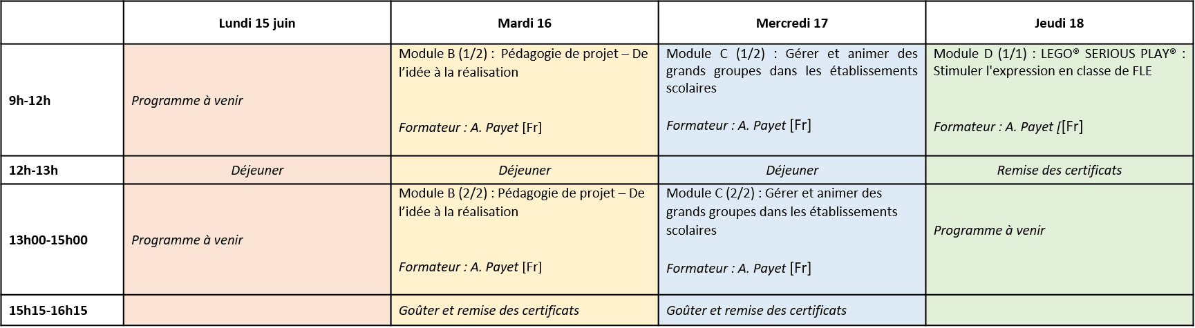 Les modules A, B, D, F sont payants. L'atelier C est gratuit
