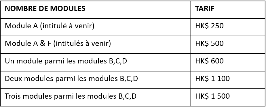 Les enseignants du Lycée Français International et des établissements labellisés School for Excellence in French (niveau 1) bénéficient de 20% de réduction. Les enseignants des établissements labellisées au niveau 2 bénéficient de 40% de réduction. Les professeurs de l'AFHK et les membres de l'AFLE dont la cotisation est à jour bénéficient d’une gratuité complète pour tous les modules.